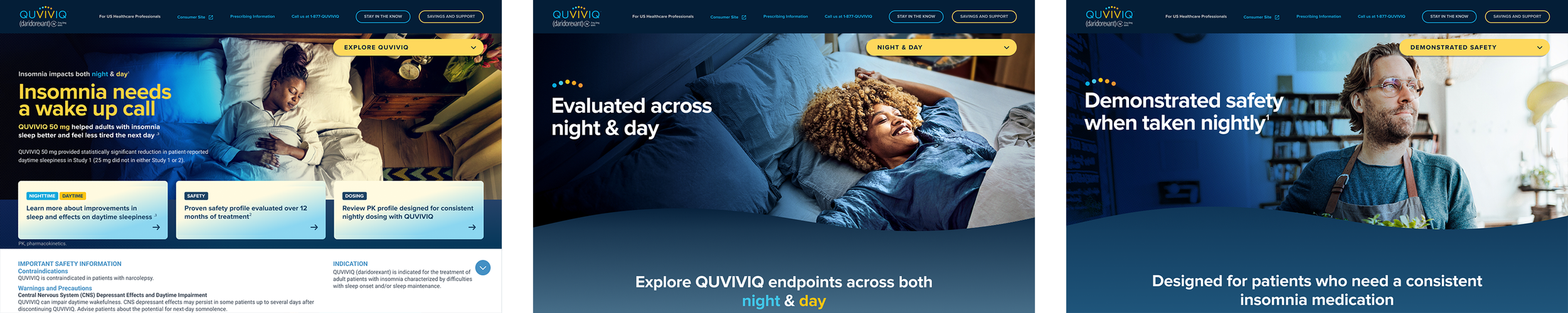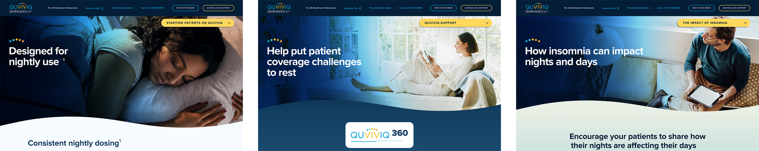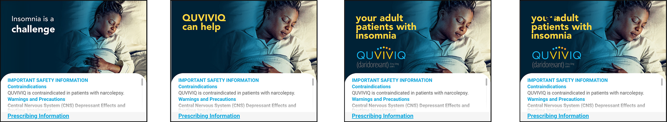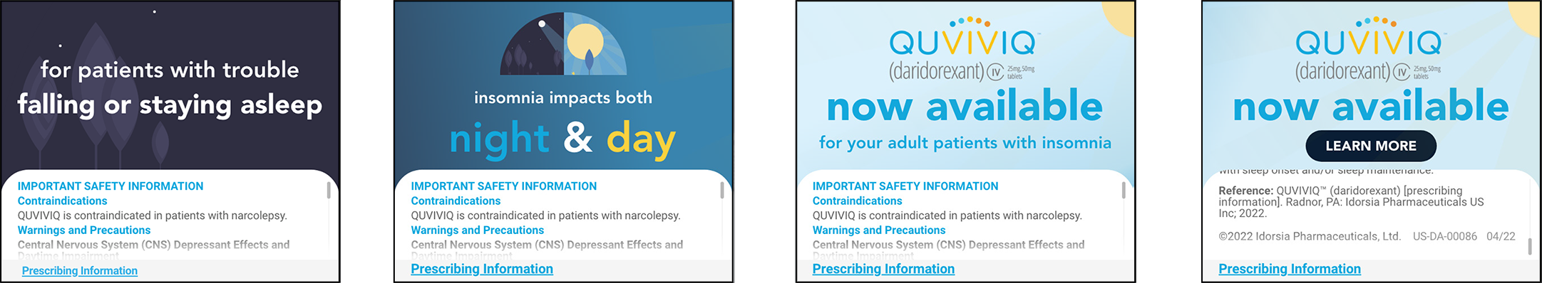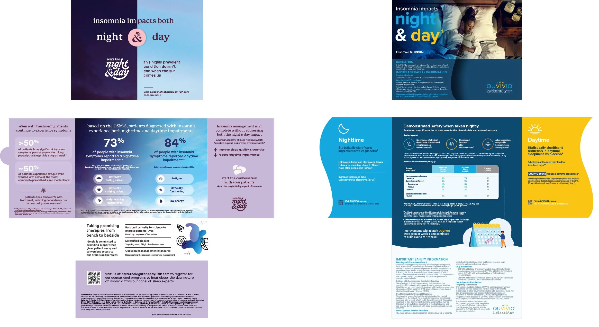 Banners, print brochures and website updates for Quiviviq, an insomnia drug that acts as a Dual Orexin Receptor Antagonist (DORA), to suppress wakefulness signals in the brain. This is a more targeted approach than common sleep aids like Ambien, which sedate the brain. Additionally, with a shorter half-life of approximately 8 hours, Quviviq has a more favorable profile for reduced daytime drowsiness compared to other DORA medications.