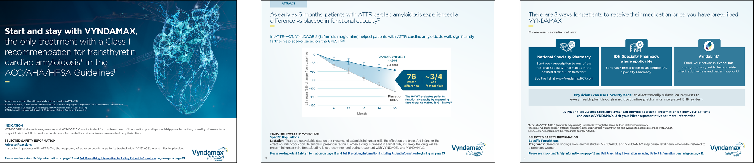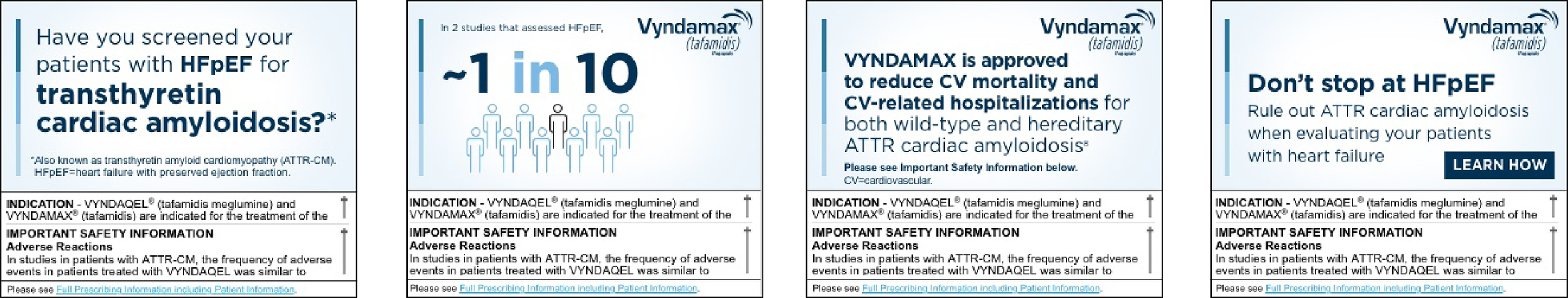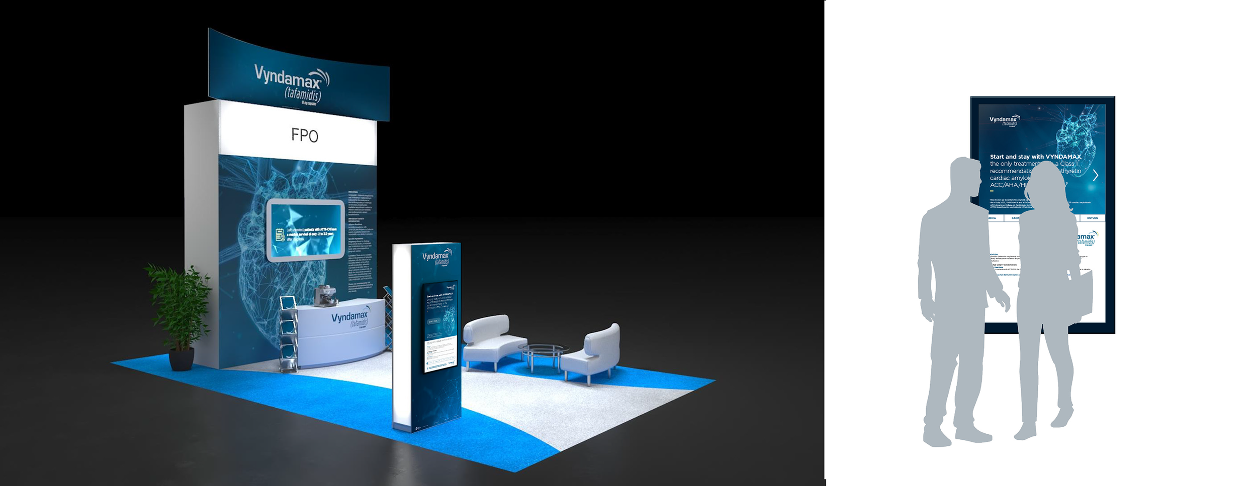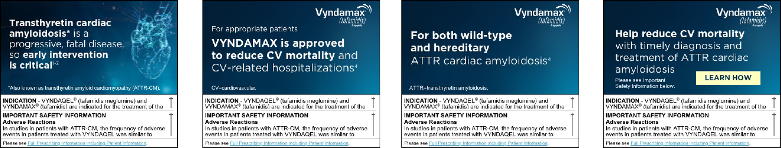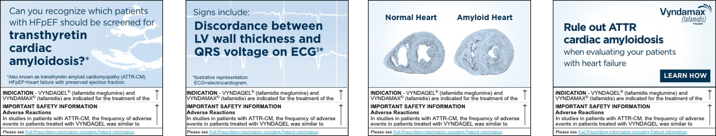 Print, digital and experintial design for Vyndamax, an oral prescription medication used to treat cardiomyopathy of wild-type or hereditary transthyretin-mediated amyloidosis (ATTR-CM) in adults. ATTR-CM is an underdiagnosed and potentially fatal disease of the heart muscle where a protein called transthyretin becomes misshapen and builds up in the heart, nerves and other organs. Vyndamax slows the progression of ATTR-CM by stabilizing the transthyretin protein, preventing it from misfolding and forming amyloid deposits in the heart.