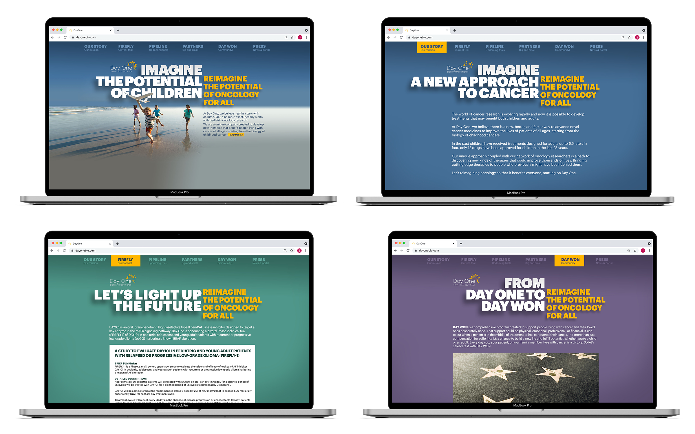 Campaign and website for Day One Pharmaceuticals, an oncology-focused biotech company that leverages research of childhood cancers to develop treatments for rare adult diseases.