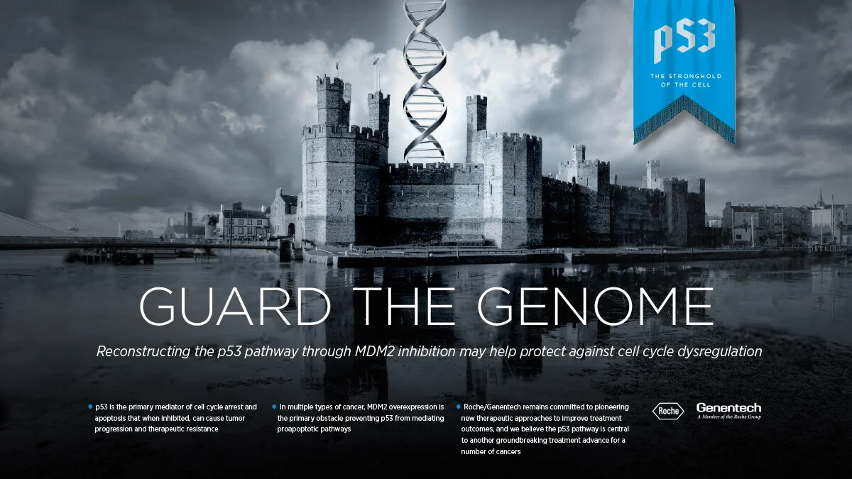 HCP unbranded concepts. Our cells contain p53, a critical tumor-suppressor gene, also called the “guardian of the genome,” that regulates cell cycle and apoptosis. However, cancer often causes a gene mutation, M2MD, which inhibits p53. Therapy that suppresses the M2MD mutation can unblock functional p53, and restore the body’s ability to destroy cancer cells.